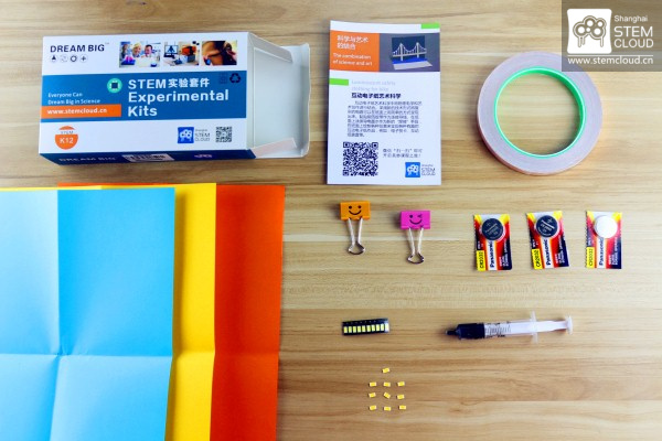 2.查看套件内容:课程说明卡片、铜箔胶带、夹子、纽扣电池、LED贴片灯珠、导电墨水、彩纸