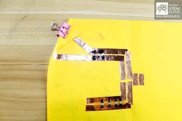 20.将彩色纸折角,确保纽扣电池的正负极都与铜箔相接触,并用燕尾夹将电池固定好