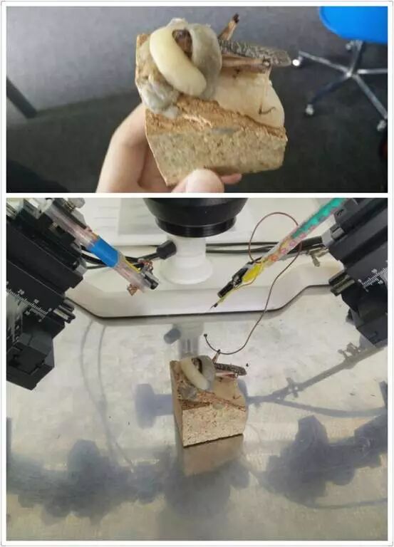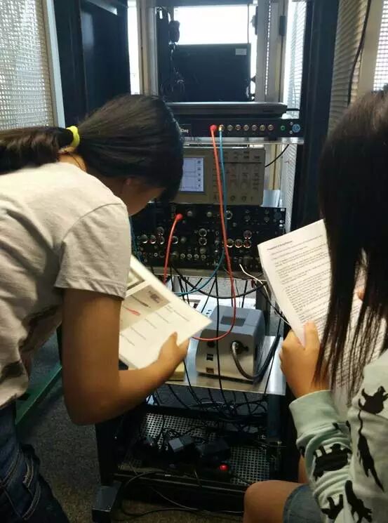 我们亲自动手的实验中最复杂的是测蝗虫眼球对不同光的敏感的程度,一直还在拍动翅膀的蝗虫被固定在仪器上,不同的光闪现消失再闪现消失,示波器上起起伏伏的线条,不断变化的数字,也让我们体会一次真正做科研的感觉。