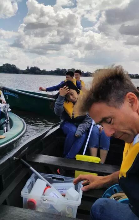 而最让我们印象深刻的,应该是环境学的户外考察。短短两天的生态环境课,我们划船来到湖中央在教授的指导下学习器材的操作,并采集各种关于水中微生物的数据,而在最后的总结课上,教授直接从我们自己所测得的数据出发,让我们自己试着解释数据的偏转,然后他再给我们详细地进行讲解,这种新颖的授课方式也让我们更加容易去接受所习得的知识。
